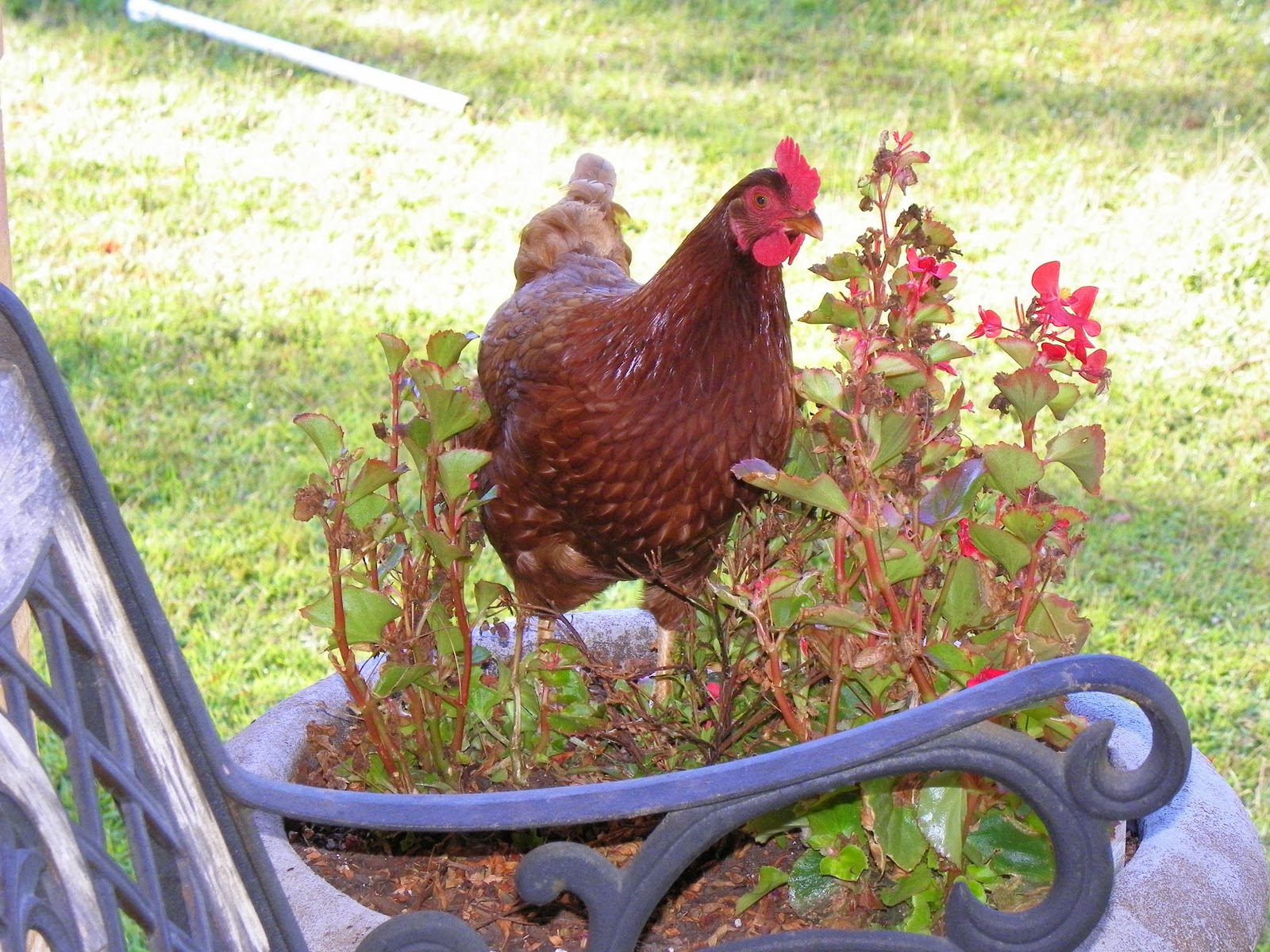 She did not want company though. She proceeded to pick off my blossoms one by one - swallowing and smiling! While watching her slowly eat my flowers, I noticed a hawk flying by. The rooster alerted the hens and they all ran for cover - except Cleo.